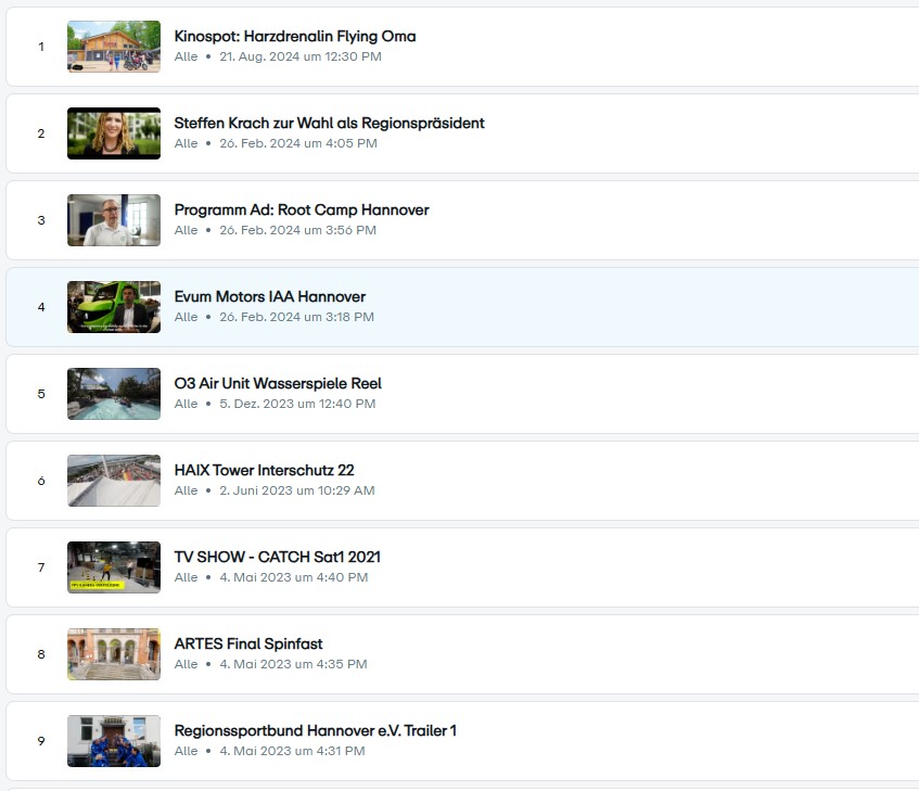 Hier siehst du eine kleine Auswahl von meinen bisherigen Arbeiten. Dabei sind Clips meiner Kunden, denen ich helfe, in den Socials durchzustarten. Dazu noch TV-Shows mit der Drohne wie WOK-WM und die RTL Wasserspiele, aber auch Imagefilme, Kampagnen-Clips und Social Media-Posts ohne Ende.